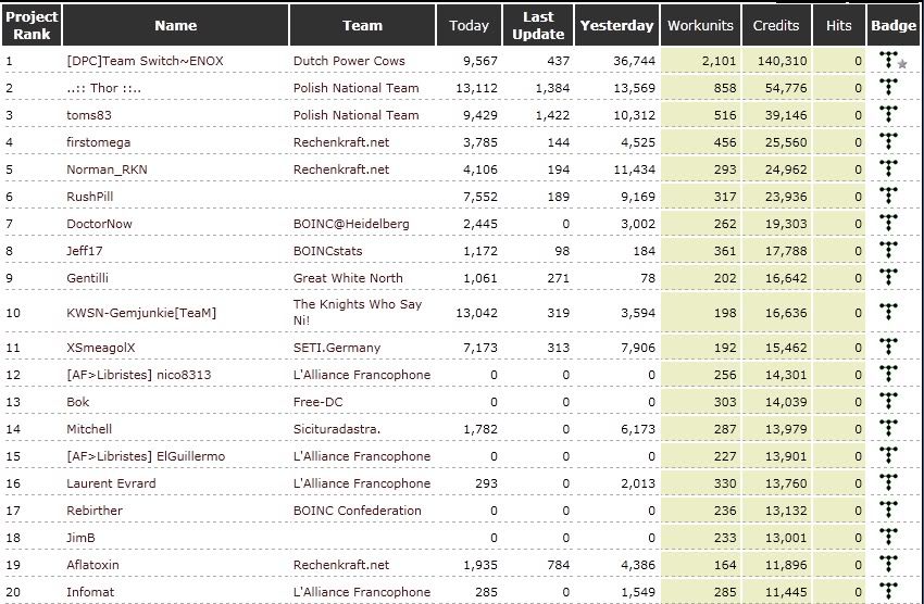 We're in 11th place, 443K behind BOINC.Italy who we are out-producing by over 40K per day... So about 10 days away from snagging a precious FB point!