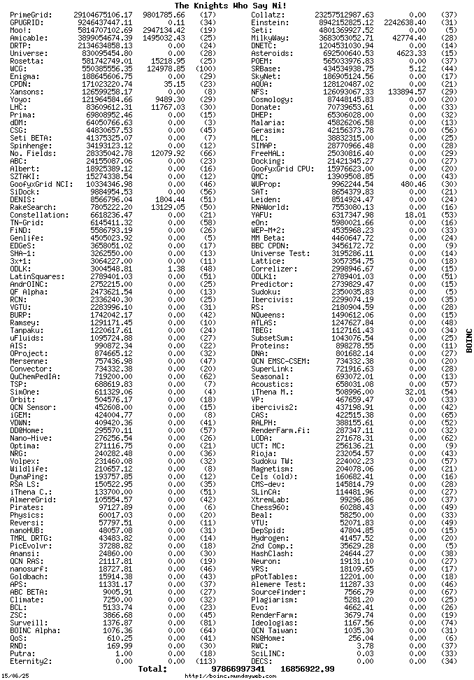 Something is screwy with our stats page. For some reason it says we are 17th, when just a few days ago we were 10th. I took a look at our combined place in BOINC Synergy stats and it seems on the 8th of May we lost -359,294,866 points and now have a lot less, and yet our stats page says we still have the 600 million range, and that should still put us in the top 10.