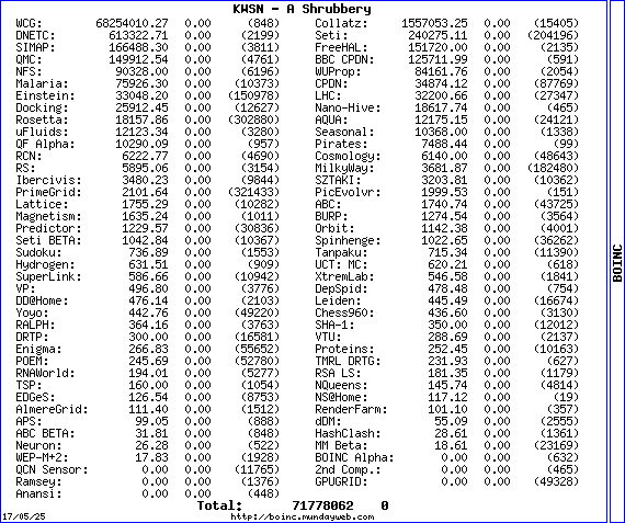 http://boinc.mundayweb.com/one/stats.php?userID=5042 _________________ A Shrubbery for Prez. Let's put more bushes in the whitehouse.
